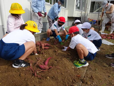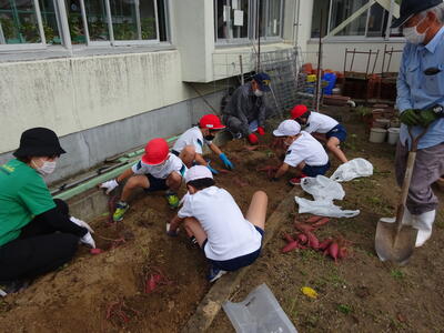 10月24日(火)に、地域から5名の指導員の方々をお迎えし、1・2年生が「サツマイモほり」をしました。指導員の方々に芋ほりの仕方を丁寧に教わり、一つ一つを大切に掘っていきました。すると、きれいな赤ムラサキ色の大きいサツマイモが次々と出てきました。子ども達は大喜び。およそ30分ぐらいで、全てのサツマイモを掘り出すことができました。