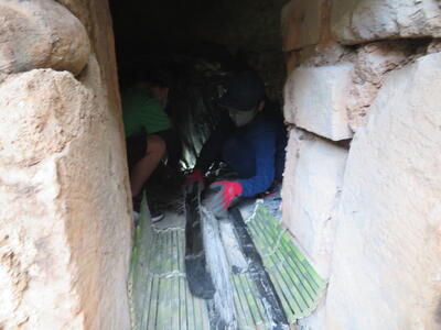 <一部空気の通り道を残し、レンガで入り口を塞ぐ指導員の方>