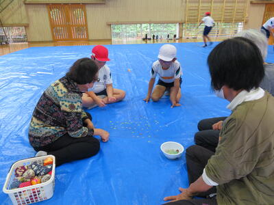 <地域の先生方にお手玉を教わる子どもたち。調子よくできるかな?>