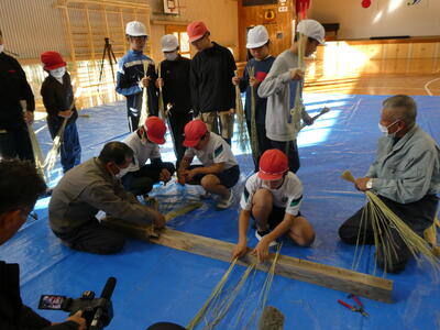 < 名人さんの指導を受けながら「しめ縄」を作る5年生(4) >