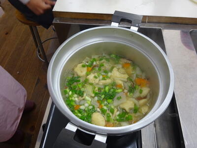子ども達は講師の先生方のお話を聞きながら、これまでに学んだ知識や技能を活<用して、出汁を作ったり、野菜を切ったり、だごをこねたりして完成させました。