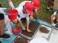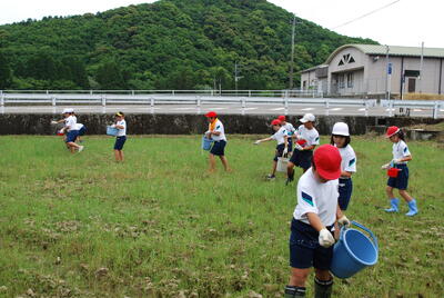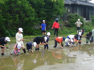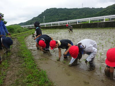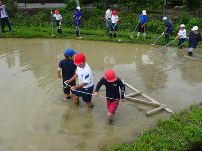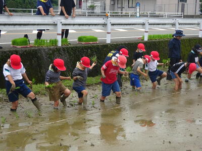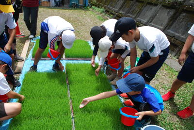 雨で延期、延期になっていた田植えの体験を6月11日に実施することができました。今年度も米づくり名人さんのご協力いただき、5年生を中心に種籾の消毒から苗床作り、除草作業、あらぐれ、肥料播き、代おし等保護者の皆様の御協力も得ながら準備をしてきました。当日は、5年生が苗の植え方について模型を使って説明をしたり、苗配りをしたりして田植えを進めていました。おそるおそる植える子、足が抜けなくて思うように前に進めず悪戦苦闘している子、コツをつかんでリズムよく植えている子等。子どもたちは、それぞれ楽しみながら田植えができました。