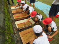 全校児童で、稲刈りの体験をしました。5年生が中心となって苗作りから頑張ってきていますが、今年も順調に大きくなり素晴らしい出来の稲になりました。1年生は、したことがない児童もいて、鎌の使い方が最初は危なかったしかったのですが、慣れてくるどんどん稲を刈っていっていました。5・6年生は、稲を束ねる作業を頑張りました。今年は、架ける棒も例年より多くしなければならないほどの豊作。おいしいお米になっているようです。早く試食したいです。