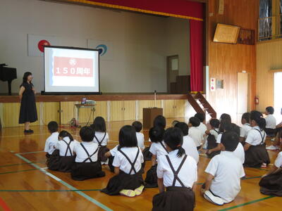 10月5日(日)に町民運動会が開催されました。この日は、運動会前に、創立150周年を祝う人文字づくりを計画しておりました。朝早くから、地域の皆様に集合いただき、小学校児童とPTA、地域の皆様で作り上げた人文字は大成功でした。ご協力いただきありがとうございました。