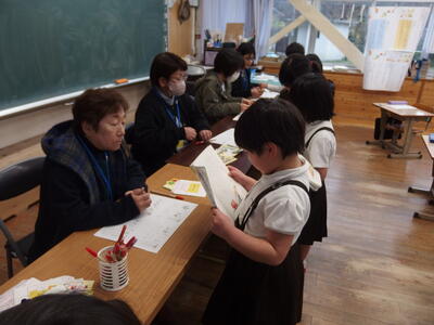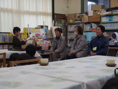 1・2年生の学習支援に、月に1回、金曜日の5時間目の後のチャレンジタイムに保護者・地域の方にお手伝いいただいています。チャレンジタイムでは、音読を聞いていただいたり、プリントの丸付けをしていただいたりしています。「上手だね。」「がんばったね。」と褒めてくださるので子どもたちもにこにこで学習意欲も向上します。今年度も13人の方にご協力いただきました。3月6日は、今年度最後のチャレンジタイムでした。1年間お世話になった感謝の気持ちを込めて「ありがとうの会」を開きました。1・2年生から感謝のメッセージと花を贈りました。