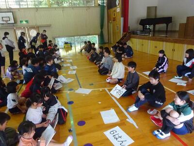 今年度の児童会活動の振り返りと次年度に向けての総会を開きました。5つの委員会の年間活動報告と次年度への課題を発表し、全校児童からの質問や要望、感想が出されました。よりよい学校にしていきたいという気持ちがとても感じられました。また、次年度の児童会の目標についても話し合いました。代表委員会で話し合った案をもとに、どんな言葉がよいか意見を出し合い決定しました。次年度の児童会は、「みずからこうどう 全力でやりきるたすけあう 本町っ子」です。
