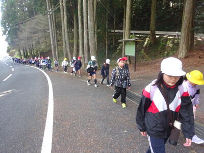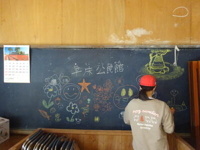 3月13日(金)にお別れ遠足を実施しました。ちょっと風が冷たくはありましたが快晴。遠足日和でした。まず、体育館で5年生が中心となって企画したレクリエーション。はじめに、縦割り班対抗「宝探しゲーム」です。体育館のあらゆるところに宝が隠されており、その宝にはポイントも書かれていました。合計ポイントが高かった班が優勝です。みんな必死になって探していました。次に、恒例の卒業する6年生の縦割り班対抗似顔絵描きリレーです。目や鼻、口などを交代で描いていきました。出来上がりもなかなかのもので、特徴を捉えている顔になっていました。最後に6年生から在校生への言葉と、各学年から6年生への言葉を贈って体育館でのレクリエーションが終わりました。そして、平床公民館ヘ出発!途中、松下尚充さんの「「やまごや」のところでトイレをお借りしました。オレンジジュースまでもいただきました。ありがとうございました。平床公民館着。楽しみにしていたお弁当とおやつの時間です。縦割り班で輪になってそれぞれ食べて、その後は、おにごっこをしたりボールで遊んだり楽しみました。平床公民館の黒板には、子どもたちの絵を描かせていただきました。