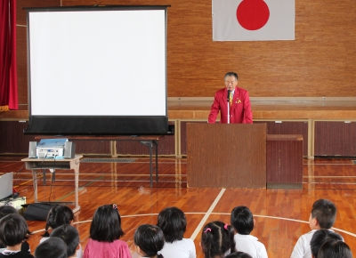 その後、ライオンズクラブについての説明があり、「ライオンズクラブは、地域の方が安全に生活できるようにいろいろな活動を行うボランティア団体です。今回は、錦ライオンズクラブ発足15周年記念の活動として、皆さんに防犯ブザーを贈ります。これからも、安全で楽しい学校生活を送って下さい。」とメッセージが伝えられました。