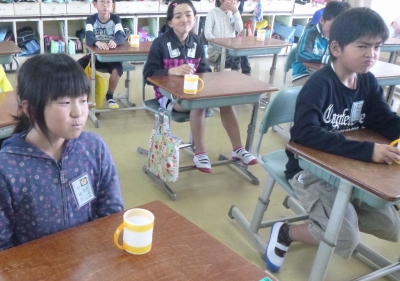 5校時終了後、先生たちがコップにフッ化物洗口液を入れ、児童はそれを口に含んで、音楽に合わせて1分間の『ブクブクうがい』を行いました。