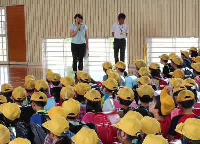 その後、担当の田中先生から「押さない・駆けない・しゃべらない・戻らないの『おかしも』を守って避難しましょう。」と注意がありました。校長先生は「火災は、いつどこで起こるかわかりません。慌てず落ち着いて考えて行動しましょう。」と呼びかけられました。