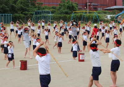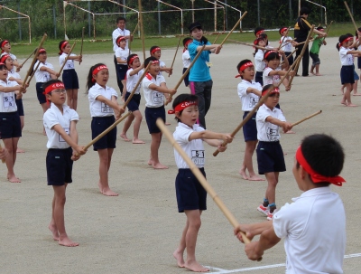 初めて素振り用の竹の棒を持つ1年生は、近くにいる先生に教えてもらったり、まわりの上級生を見ながら「めーん!」と大きなかけ声をかけながら、一生懸命取り組むことができました。