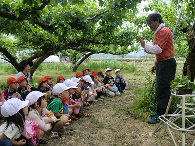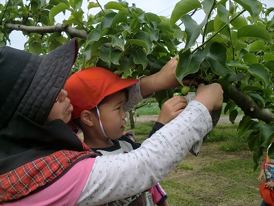 牟田梨園では、最盛期を迎えた梨と桃の摘果(てきか)と袋かけの見学と体験をさせていただきました。子どもたちも真剣に話を聞き、作業に取り組んでいました。