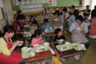 子どもたちも、お家の人と一緒に食べる給食を、少し恥ずかしそうにしながらも、笑顔で食べていました。