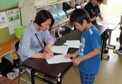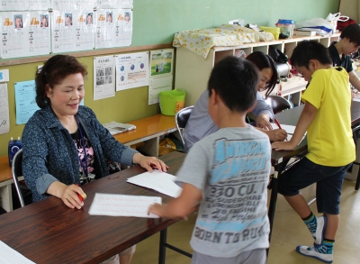 子どもたちは、ボランティアの先生に丸付けをしていただけるということで、「1番に持って行こう!」と競い合ってプリントをします。先生から「すごいね。よくできたね。」と褒められると、子どもたちはとても喜びます。しかし、早く持ってこようとするあまり、字が雑になる子どももいますが、そのようなときには、ボランティアの先生はきちんと注意を促して下さいます。