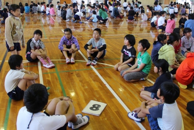 続いて、児童の運営による「クローバー集会」が行われました。5月は運営委員会が担当で、最初に運営委員会の自己紹介があった後、1年生から6年生までのみんなが仲良くなるようにと「そーれ、ポン」というゲームを行いました。短い時間でしたが、全校児童で「仲間づくり」のゲームを楽しみました。