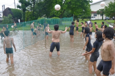 6月15日(月) 5・6時間目に、5年生が田植え前の「代掻き」を行いました。水がいっぱいに張られた学校田の中の土を「ビーチバレーボール」をしながら,楽しくかき混ぜることができました。