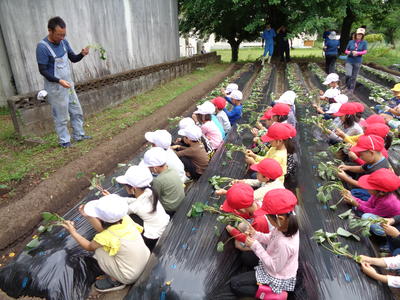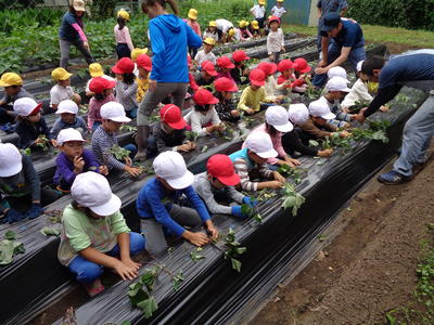 JAの方に芋の苗植えの仕方を教えていただいた後に、実際に芋の苗を植えました。子どもたちからは、「難しいと思ったけど、やってみると簡単でした。楽しかったです。」「はやく食べたいです。」等の感想が聞かれました。