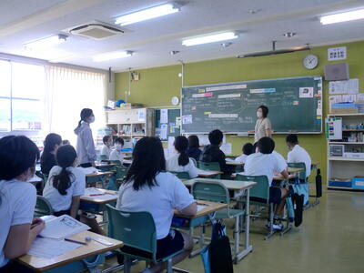 16日(木)5校時に2年生学活で食育の授業が行われました。錦中の冨永栄養教諭をゲストティーチャーに迎え授業を行いました。