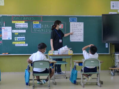 先生も参加し、楽しくゲームに取り組んだあとに、「振り返り」として、「何がたのしかったかな?」「どうしてたのしかったのかな?」と、先生がやさしく問いかけられる言葉に、自分なりの楽しさの理由を発表することができていました。