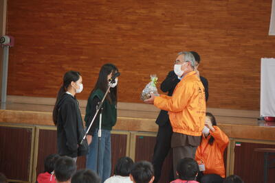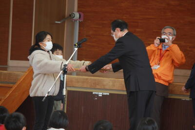 校長先生からは、2学期の重点目標である「あいさつ」についての話がありました。「2学期は、重点目標を『自分からあいさつ』として取り組んできましたが、この目標を一人一人が意識して学校生活を過ごしている様子が毎日の様子でよくわかりました。そして、学期末の児童アンケート、先生方のアンケートからも、「自分からあいさつをしている」という回答が多くなり、とてもうれしかったです。2学期皆さん頑張りましたね。明日からの冬休みの間も、ぜひ地域であいさつを頑張りましょう。」と話がありました。