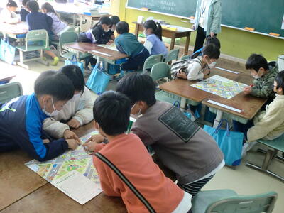 9日(金)に、1年生で「7歳の交通安全マップ」を使った交通安全についての学習を行いました。