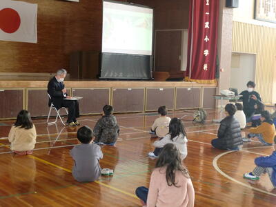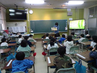 さらに、学校運営協議会委員でもある牟田弘美様に、梨の木の冬の様子や枝についている芽の中身についてお話をいただきました。梨の木は、冬の間、しっかり眠りにつき、枝に木の芽をつけます。「みんなが元気に過ごすための毎日(しっかり寝て、しっかり栄養をとって、元気に過ごす毎日)と一緒だね!」と言われた言葉に、1年生の子どもたちも、しっかりうなずいていました。