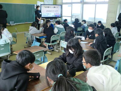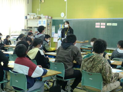 16日(木)5校時に2年生学活で食育の授業が行われました。錦中の冨永栄養教諭をゲストティーチャーに迎え授業を行いました。