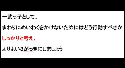 校長先生の話は、「みんなが暮らす毎日には、ルールがあり、人への「思いやり」が大切です。」という内容でした。残りの1ヶ月、「考える一武っ子」として、頑張ってほしいと思います。