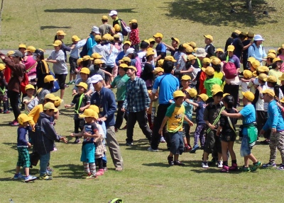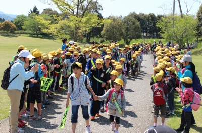 その後、全員、くらんど公園に歩いて移動しました。くらんど公園では、先に到着した2~5年生が、6年生と仲良く手をつないだ1年生を拍手で迎えました。