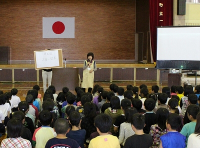 就任式で田山先生は、先生が好きな絵本「オレンジいろのペンギン」の内容を引用され、「ひとりひとりが仲間のために頑張ろうとすることは、とても素晴らしいことです。私も早く一武小の一員になれるように頑張ります。」と話をされました。
