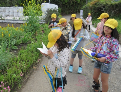 5月1日(木) 3年生・社会科の学習で「学校のまわり探検」を行い、北・西コース、南・東コースに分かれて、学校の周りには、どんな建物があるのか、どんなところに住宅や田畑が多いのかなどを調べました。