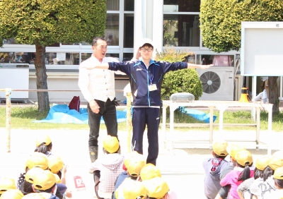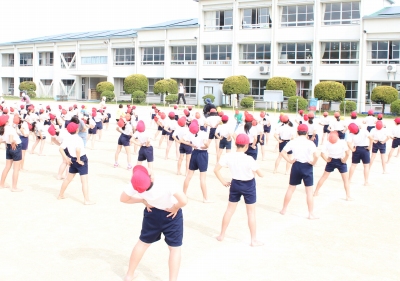 5月8日(木) 毎月第1・第4木曜日の朝の時間を活用して「体力アップタイム」があります。今日は、その第1回目で、集合・整列とラジオ体操の仕方を学びました。