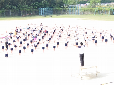 指令台の上から、体育主任の山下先生が『気合い』の入った声で指導されました。子どもたちはそれに応え、大きな返事やかけ声をかけ、元気にラジオ体操を行いました。