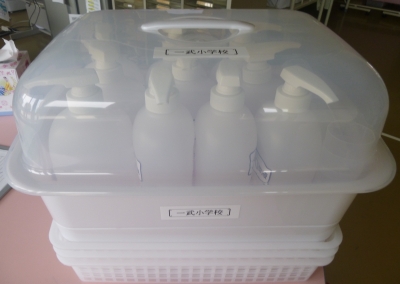 | このようなケースに入って、保健センターから届きます。 | 各自のコップに、洗口液を2プッシュ入れます。 | 音楽に合わせた1分間の『ブクブクうがい』はあっという間でした。 |