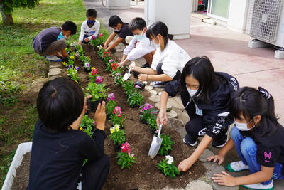 各学級の花壇に、4種類の花の苗を植えました。色鮮やかで、とても綺麗な花壇になりました。