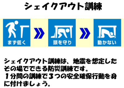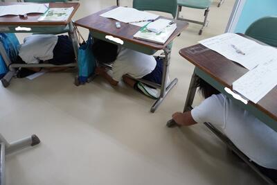 今日は、学校で地震が起きた場合を想定した「シェイクアウト訓練」を2時間目の授業中に行いました。