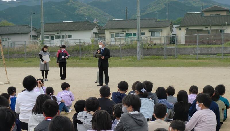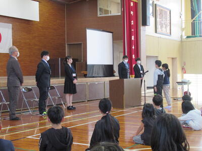 就任式では、新しく5名の先生方をお迎えしました。子どもたちは、新しく来られた先生方の話にしっかり耳を傾けながら聞くことができました。
