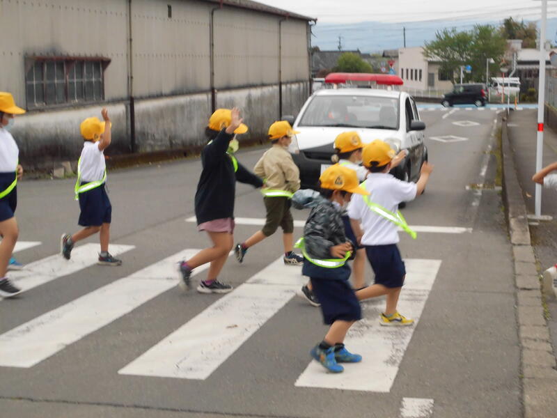 1年生は、交通公園で横断歩道の渡り方の練習をした後に、学校前の横断歩道で実際に渡りました。みんなしっかりと安全確認をしながら正しくできました。