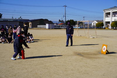 今日は、東分署の方に来ていただき、消火器の扱い方の説明や、火事が発生した場合の行動についてお話していただきました。その後、消火訓練を4年生~6年生の代表者と職員が行いました。実際に発生したときを意識して、真剣に取り組むことができました。