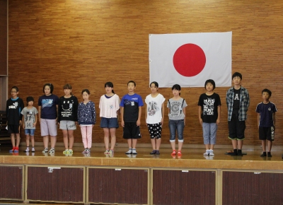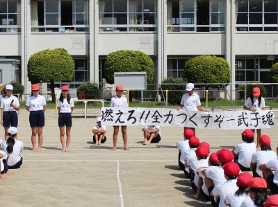 9月8日(月) いよいよ運動会の全体練習が始まりました。今日は、『結団式』が行われ、最初に運営委員の児童から運動会スローガンの発表がありました。今年のスローガンには、5年2組が提案した「燃えろ 全力を尽くすぞ 一武っ子魂」が採用されました。