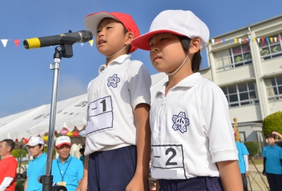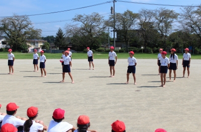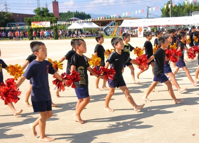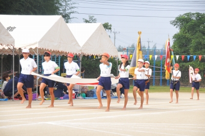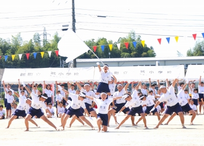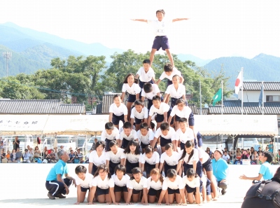 運動会の見せ場ともいえる「高学年の組体操」では、音楽や笛の合図に合わせて統率のとれた素晴らしい演技が披露され、最後は7段ピラミッドを完成させ、会場のみなさんから大きな拍手を受けました。組体操の演技後、6年生代表児童が「練習では厳しく怒られたこともあったけど、立派な組体操にするために頑張りました。全員で心を合わせて頑張ることのすばらしさを学びました。」と、みんなの前で感想を述べました。
