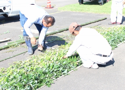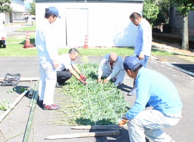 9月25日(木) 平日の昼間という、お忙しい時間帯にも関わらず、杉の会の方々で「笹掻き」を製作していただきました。これは、運動会の来賓席の飾りに使用され、「杉門」と同様、一武小学校運動会の「名物」となっています。