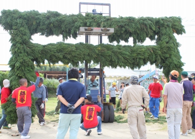| 保護者と一緒に、杉枝を1本1本わらに挿します。 | リフトを使って、杉門を引き上げます。 | 6年生の保護者と杉の会の方々で完成記念写真! |