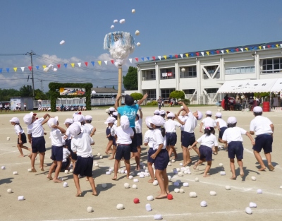 | みんなで協力!何個入るかな? (低学年・玉入れ) | 元気いっぱいに踊りました。 (中学年・ダンス) | 7段ピラミッド、完成!! (高学年・組体操) |