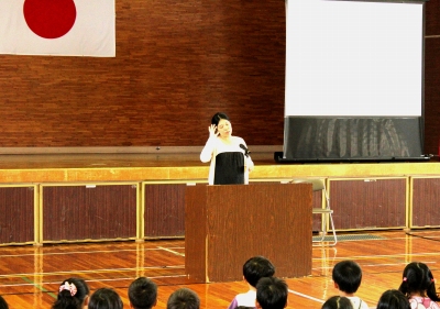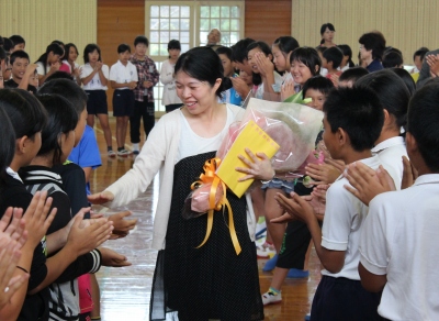 退任式では、「みなさんと過ごした3年半は、とても楽しかったです。元気な赤ちゃんを産みます。」とあいさつをされました。そして、児童の代表が「たくさんのことを教えていただきました。先生のことは忘れません。ありがとうございました。」と、お別れの言葉を述べました。