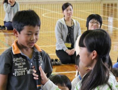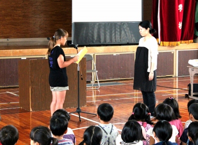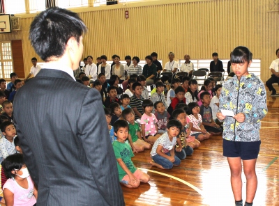 続いて、児童代表が「吉原先生が退職され、寂しい思いをしていましたが、堤先生に来ていただいたので、とてもうれしいです。これからよろしくお願いします。」と、歓迎の言葉を述べました。