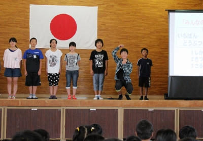 10月6日(月) 今月のクローバー集会は、図書委員会からの発表でした。9日(木)からの校内読書旬間を控え、図書委員が各学年向けにおすすめの本のタイトルを紹介しました。そして、その内容について簡単なクイズを出し、みんなが本を読みたくなるように工夫した発表を行いました。