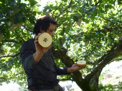 梨について説明をする牟田さん。 | 「梨の木の寿命はどれくらいですか?」 |