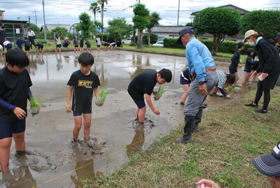 JA青壮年部の方々のご指導のもと、2年生が夏野菜の苗植えを行いました。