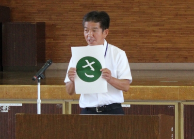 続いて田山先生から、今月の生活目標の『人の話をよく聞こう』について、「『きく』という漢字には『聞く』と『聴く』があります。『聴く』という字は、耳と目と心を合わせて(たして)できあがります。今月の目標は、ぜひこちら(聴く)で、人の話を聴いて下さい。」と指導をされました。